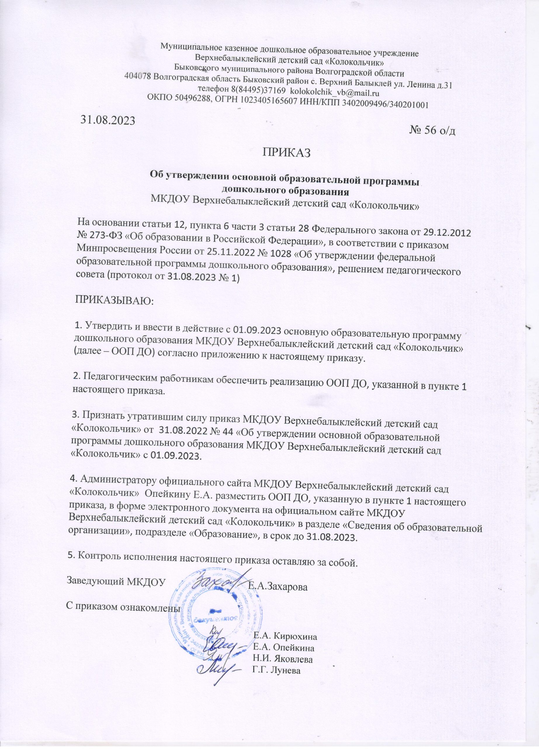 - Приказ об утверждении основной образовательной программы дошкольного образования МКДОУ Верхнебалыклейский детский сад «Колокольчик»